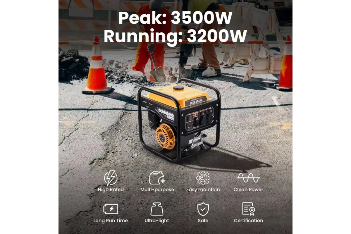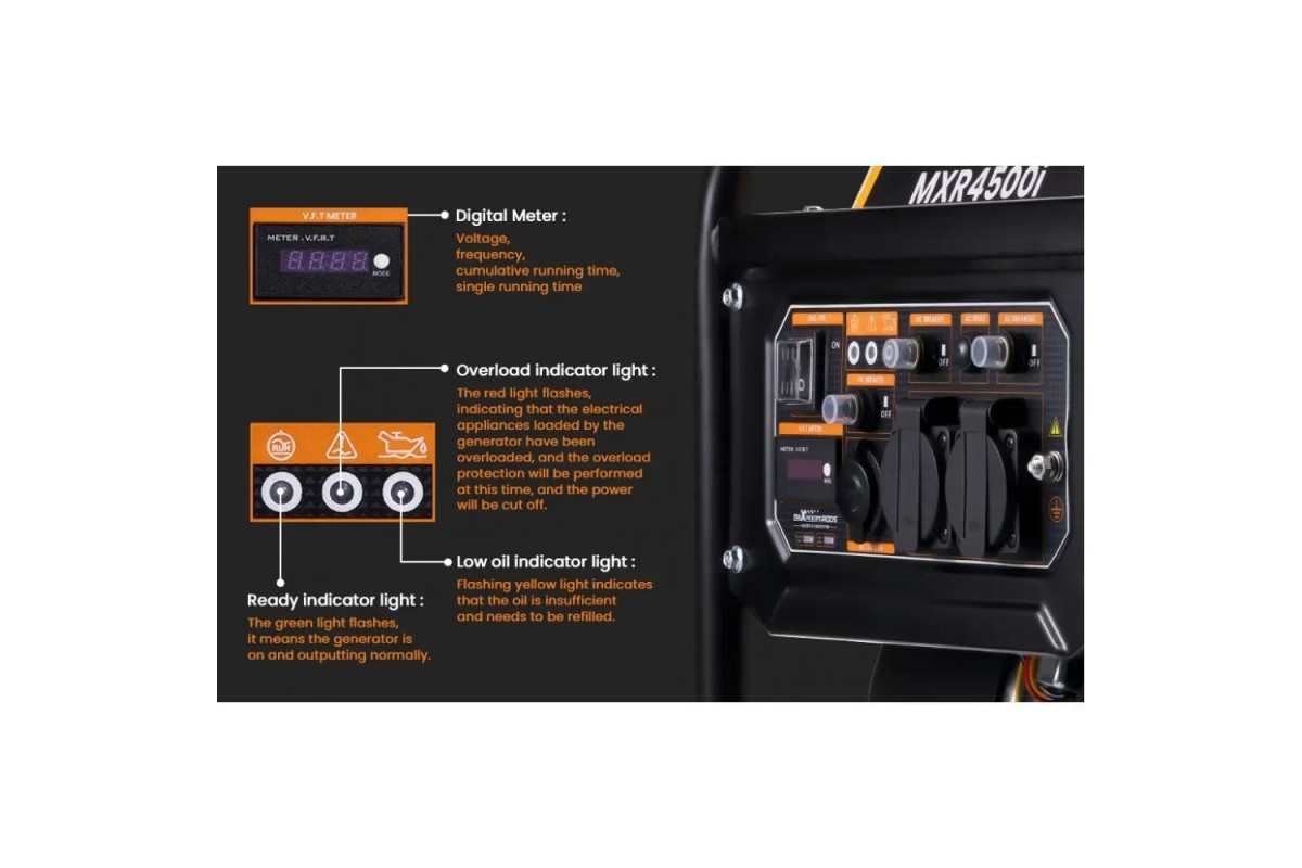 Інверторний генератор електроенергії MXR4500i забезпечує не тільки живлення великої побутової техніки та електроінструментів, але також служить резервним генератором у разі збою електроенергії. Ідеально підходить для кемпінгу на відкритому повітрі / кемпінгу, вечірок на відкритому повітрі, у саду, весілля на відкритому повітрі, подорожі на автофургонах, екстрене використання тощо. Вам більше ніколи не доведеться залишатися без електроенергії.