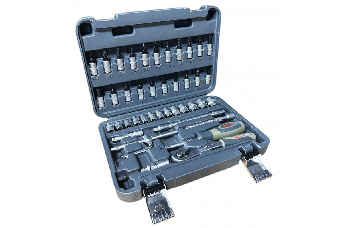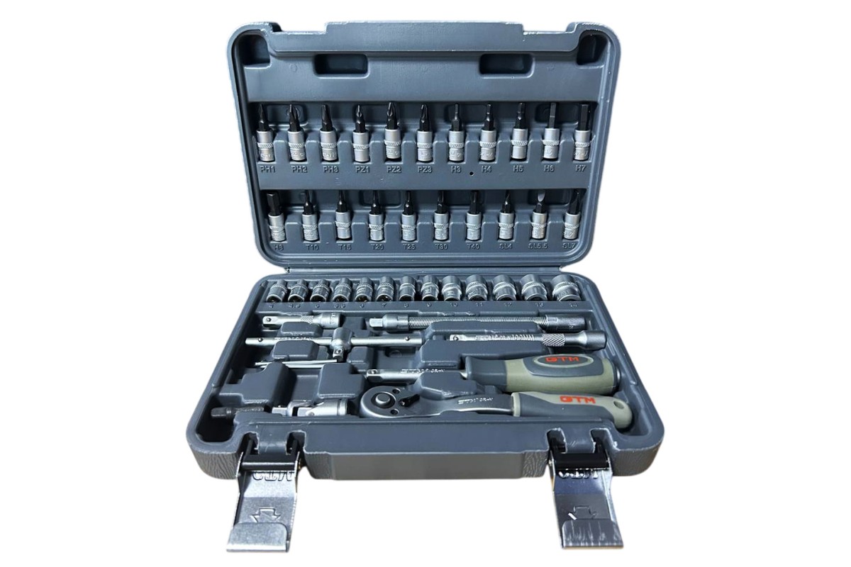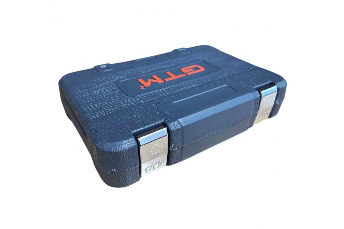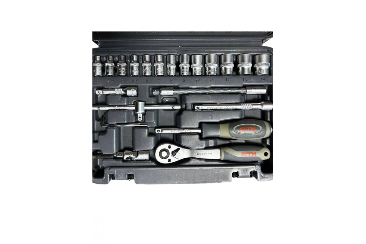 GTM GTS-046 - універсальний набір інструментів, призначений для використання вдома, в майстернях і СТО. Всі інструменти виготовлені з високоякісного сплаву хромо-ванадієвої сталі. Завдяки цьому набір не боїться корозії і впливу вологи. Включає в себе торцеві головки 1/4", тріскачку, шестигранні ключі, воротки і перехідники. Поставляється у фірмовому ударостійкому захисному кейсі GTM.