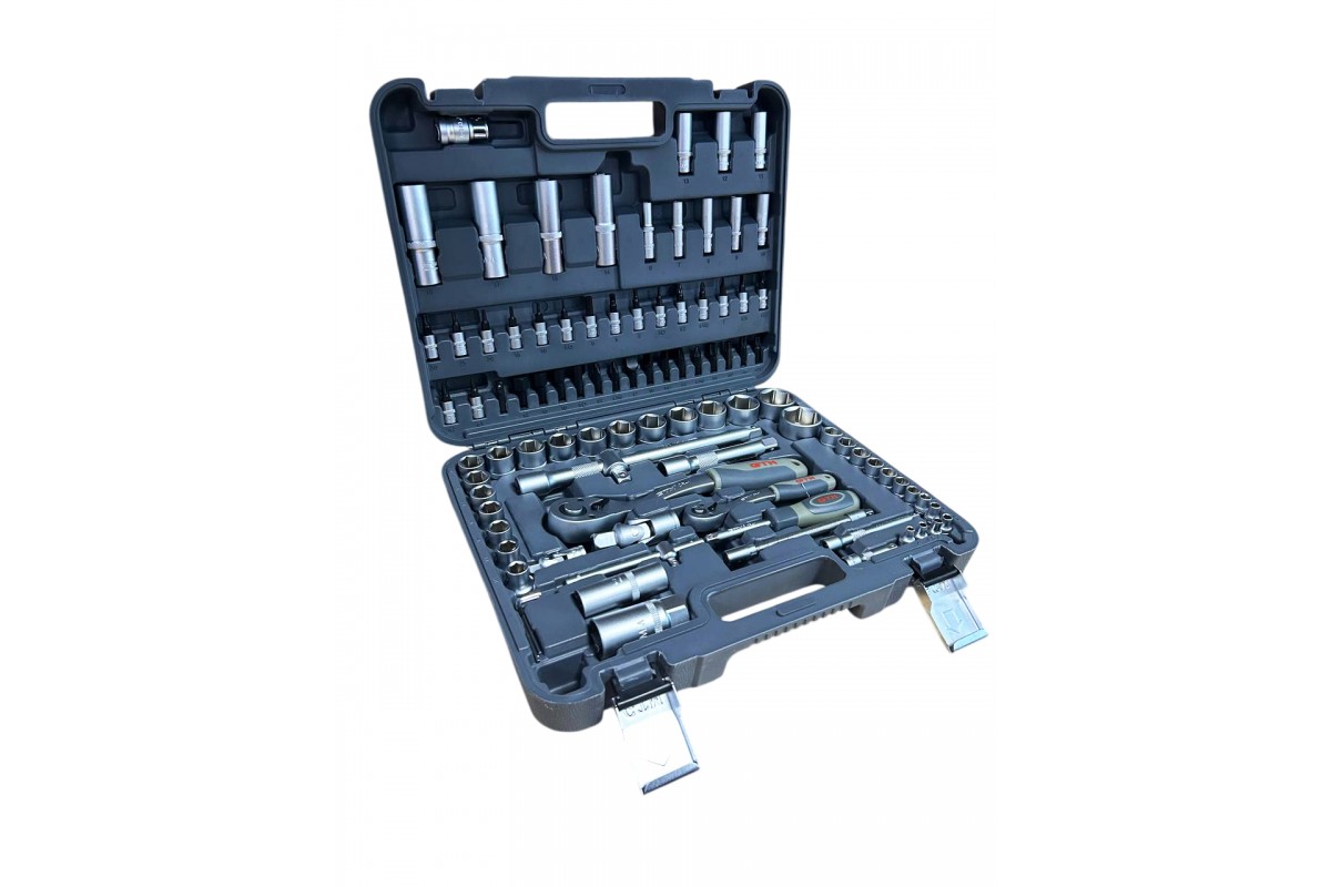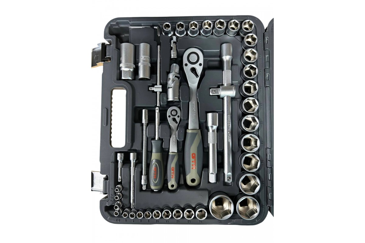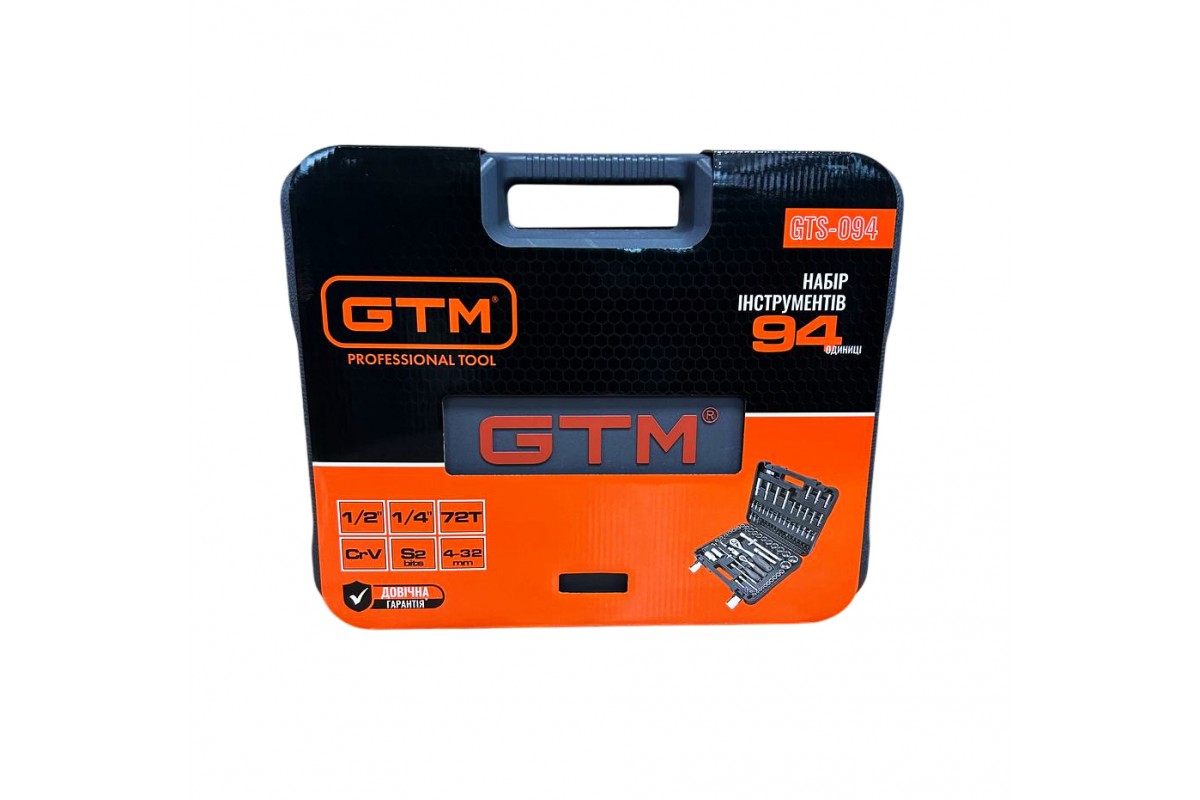 GTM GTS-094 - універсальний набір інструментів, призначений для використання вдома, в майстернях і СТО. Всі інструменти виготовлені з високоякісного сплаву хромо-ванадієвої сталі. Завдяки цьому набір не боїться корозії і впливу вологи. Включає в себеторцеві головки 1/4" та 1/2", тріскачки, воротки і перехідники. Поставляється у фірмовому ударостійкому захисному кейсі GTM.