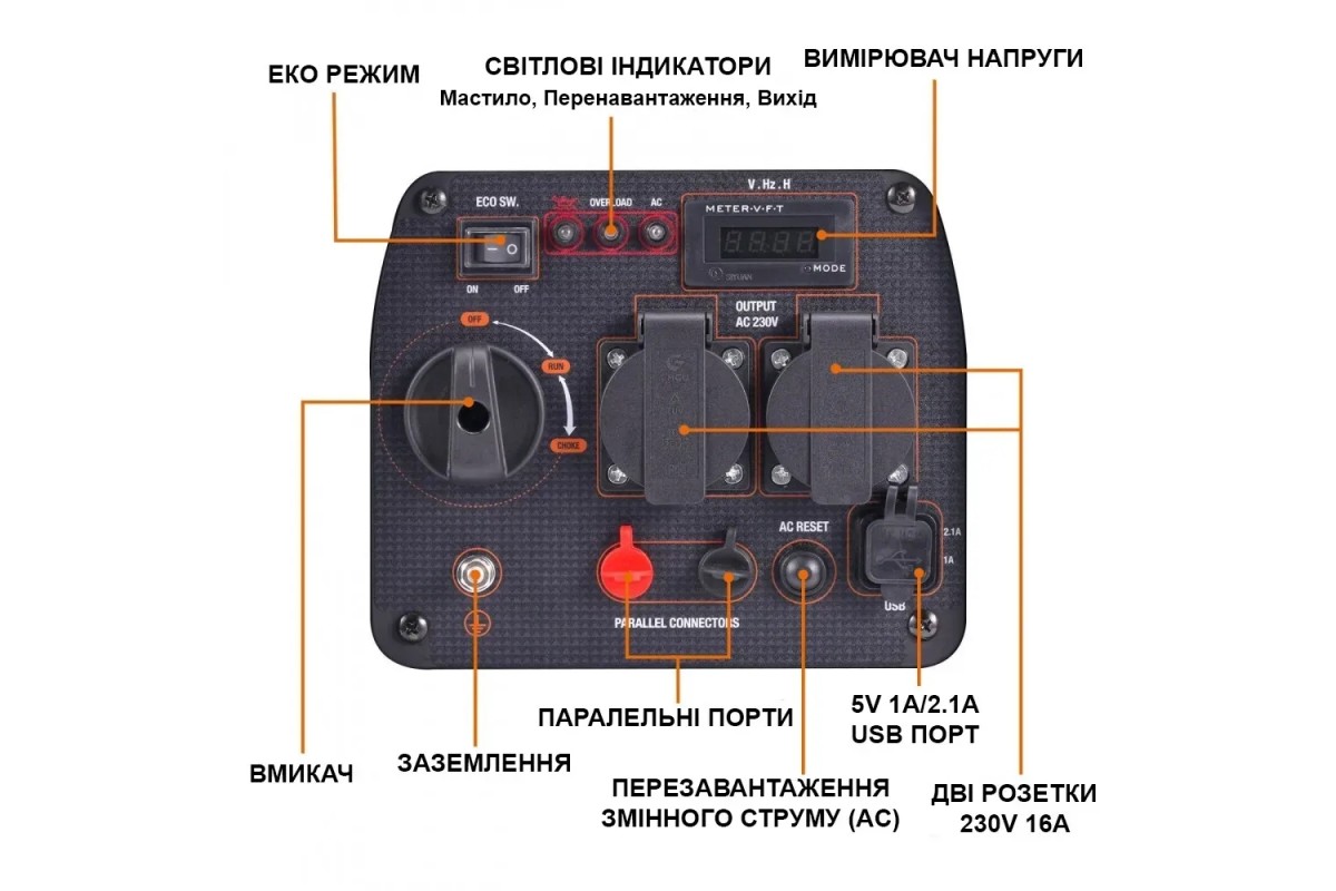 - Світлодіодний дисплей для робочого стану, попередження про рівень масла та вимикач змінного струму та вимикач скидання.